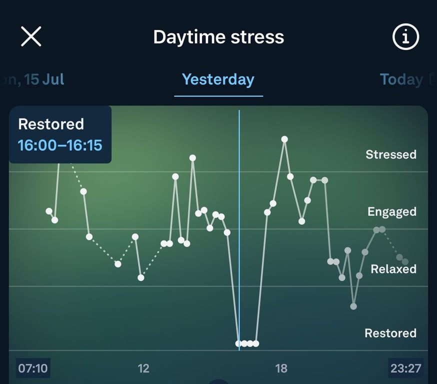 The blue line indicated the point her reflexology session finished. The session helped support marked stress reduction and the body entering a period of restoration.